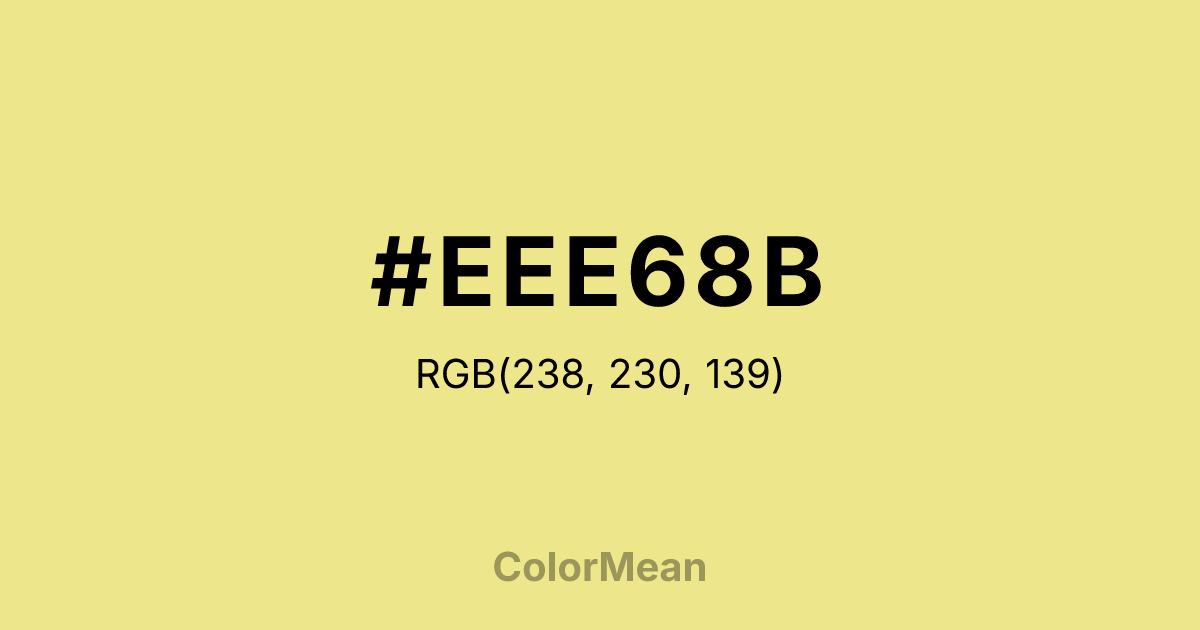 #EEE68B RGB value is (238, 230, 139). The hex color red value is 238, green is 230, and blue is 139. Its HSL format shows a hue of 55°, saturation of 74 percent, and lightness of 74 percent. The CMYK process values are 0 percent, 3 percent, 42 percent, 7 percent.