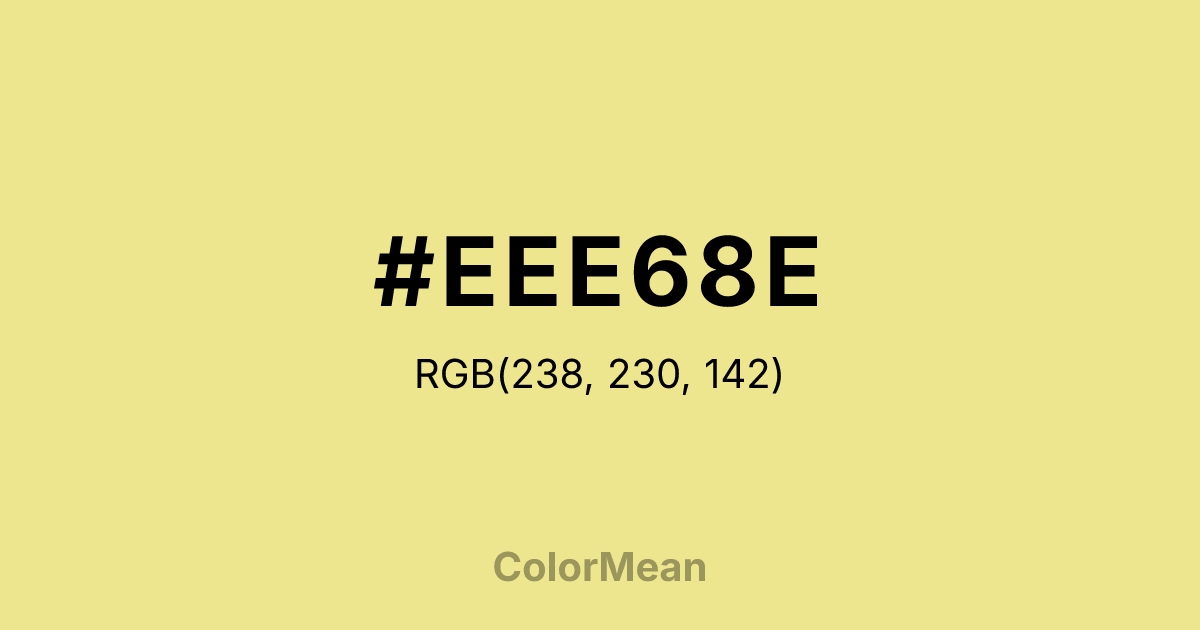 #EEE68E RGB value is (238, 230, 142). The hex color red value is 238, green is 230, and blue is 142. Its HSL format shows a hue of 55°, saturation of 74 percent, and lightness of 75 percent. The CMYK process values are 0 percent, 3 percent, 40 percent, 7 percent.