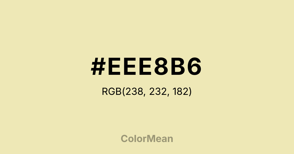 #EEE8B6 RGB value is (238, 232, 182). The hex color red value is 238, green is 232, and blue is 182. Its HSL format shows a hue of 54°, saturation of 62 percent, and lightness of 82 percent. The CMYK process values are 0 percent, 3 percent, 24 percent, 7 percent.