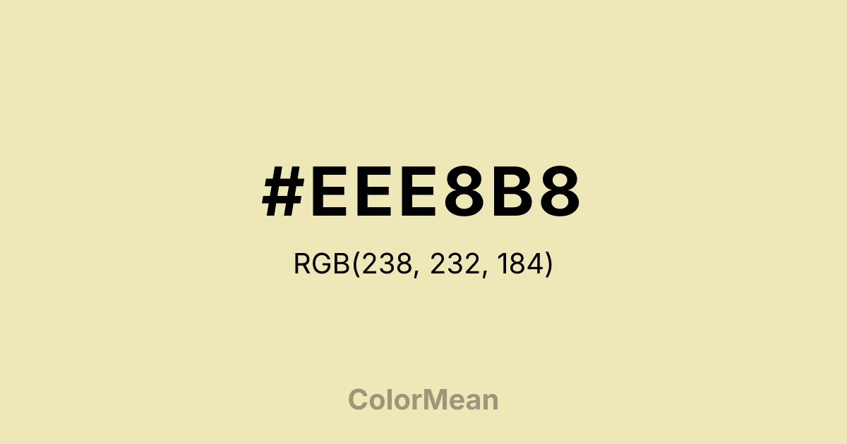 #EEE8B8 RGB value is (238, 232, 184). The hex color red value is 238, green is 232, and blue is 184. Its HSL format shows a hue of 53°, saturation of 61 percent, and lightness of 83 percent. The CMYK process values are 0 percent, 3 percent, 23 percent, 7 percent.