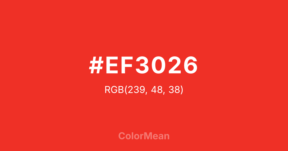 #EF3026 RGB value is (239, 48, 38). The hex color red value is 239, green is 48, and blue is 38. Its HSL format shows a hue of 3°, saturation of 86 percent, and lightness of 54 percent. The CMYK process values are 0 percent, 80 percent, 84 percent, 6 percent.