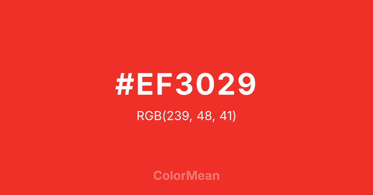 #EF3029 RGB value is (239, 48, 41). The hex color red value is 239, green is 48, and blue is 41. Its HSL format shows a hue of 2°, saturation of 86 percent, and lightness of 55 percent. The CMYK process values are 0 percent, 80 percent, 83 percent, 6 percent.