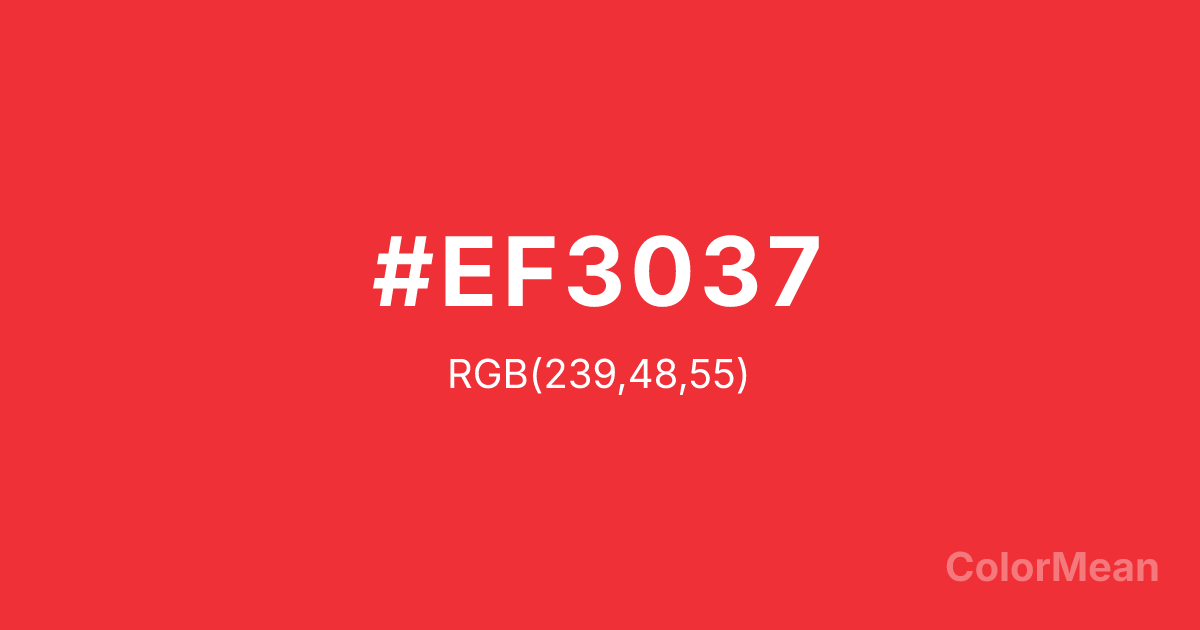#EF3037 RGB value is (239, 48, 55). The hex color red value is 239, green is 48, and blue is 55. Its HSL format shows a hue of 358°, saturation of 86 percent, and lightness of 56 percent. The CMYK process values are 0 percent, 80 percent, 77 percent, 6 percent.