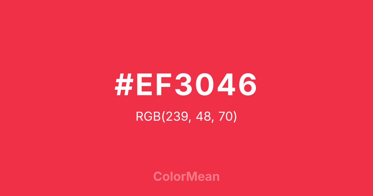 #EF3046 RGB value is (239, 48, 70). The hex color red value is 239, green is 48, and blue is 70. Its HSL format shows a hue of 353°, saturation of 86 percent, and lightness of 56 percent. The CMYK process values are 0 percent, 80 percent, 71 percent, 6 percent.