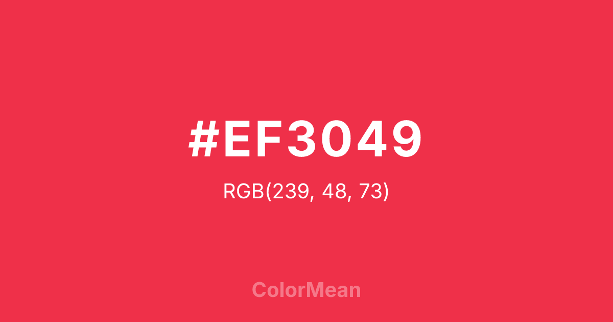 #EF3049 RGB value is (239, 48, 73). The hex color red value is 239, green is 48, and blue is 73. Its HSL format shows a hue of 352°, saturation of 86 percent, and lightness of 56 percent. The CMYK process values are 0 percent, 80 percent, 69 percent, 6 percent.