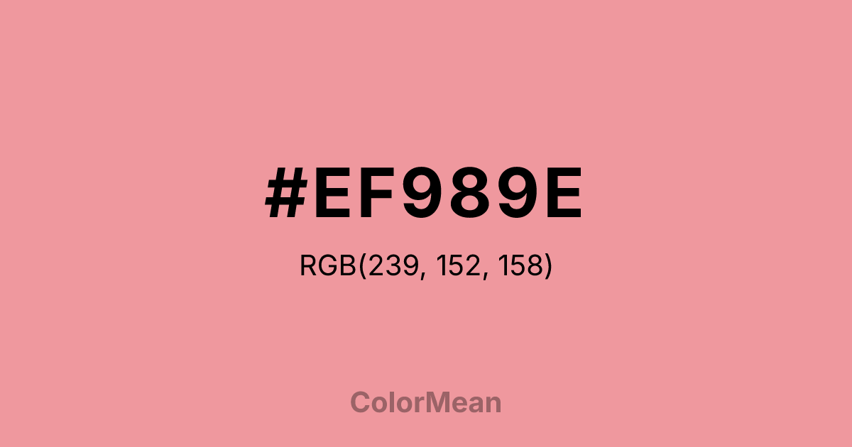 #EF989E RGB value is (239, 152, 158). The hex color red value is 239, green is 152, and blue is 158. Its HSL format shows a hue of 356°, saturation of 73 percent, and lightness of 77 percent. The CMYK process values are 0 percent, 36 percent, 34 percent, 6 percent.