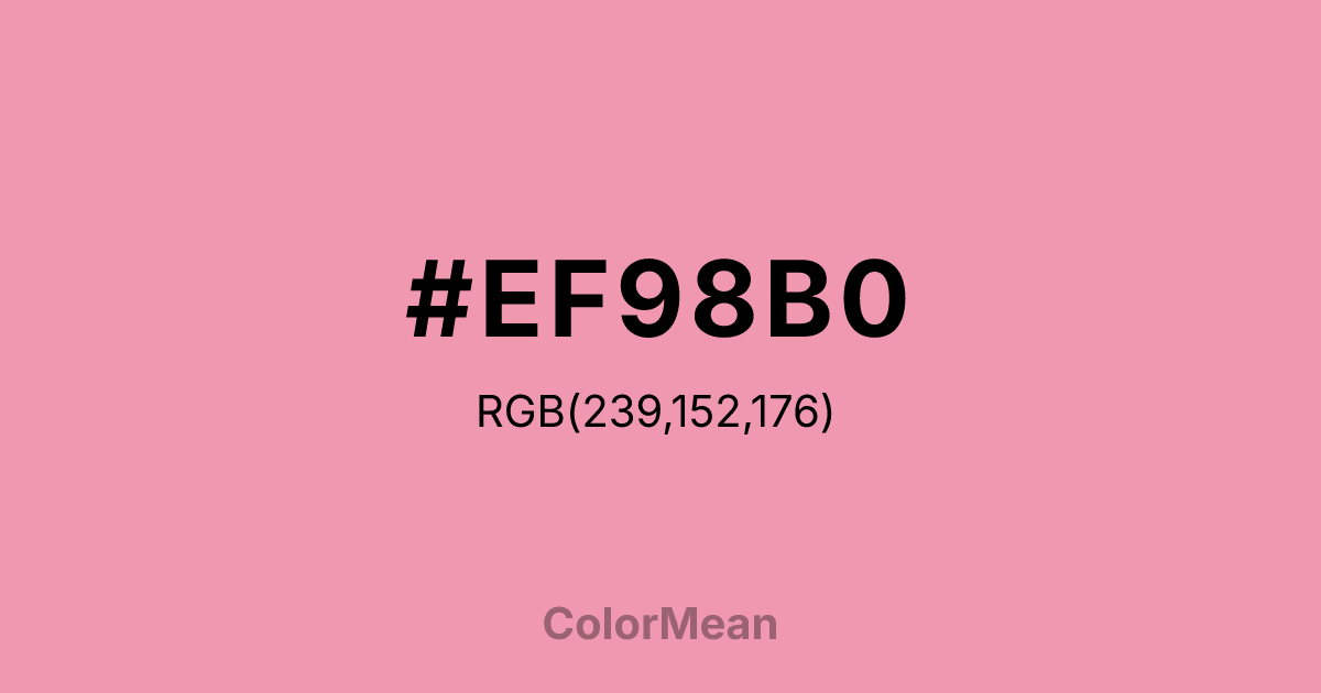 #EF98B0 RGB value is (239, 152, 176). The hex color red value is 239, green is 152, and blue is 176. Its HSL format shows a hue of 343°, saturation of 73 percent, and lightness of 77 percent. The CMYK process values are 0 percent, 36 percent, 26 percent, 6 percent.