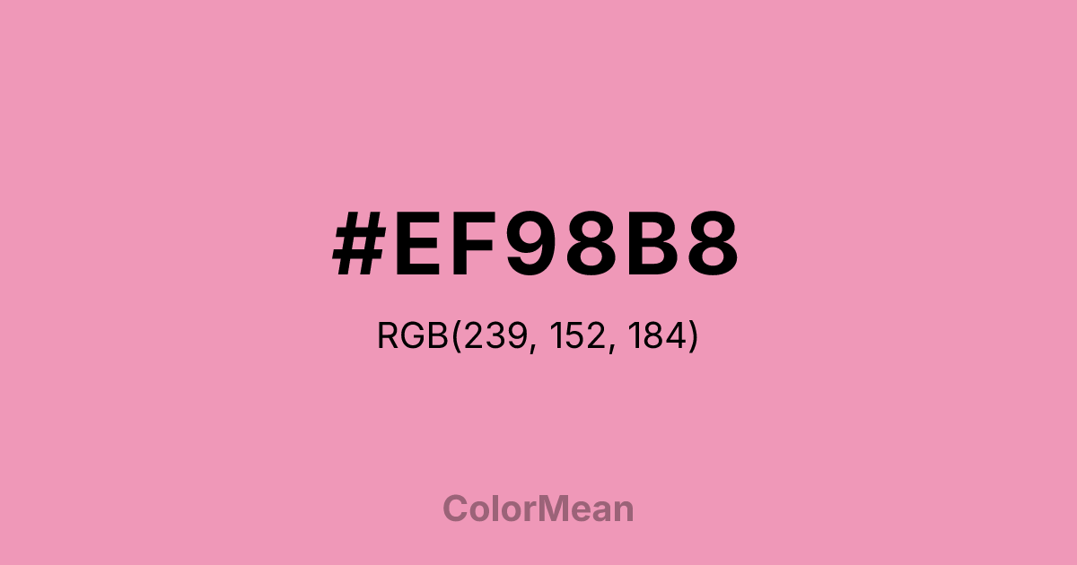 #EF98B8 RGB value is (239, 152, 184). The hex color red value is 239, green is 152, and blue is 184. Its HSL format shows a hue of 338°, saturation of 73 percent, and lightness of 77 percent. The CMYK process values are 0 percent, 36 percent, 23 percent, 6 percent.