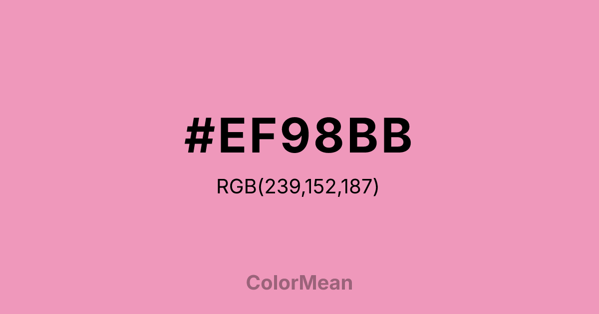 #EF98BB RGB value is (239, 152, 187). The hex color red value is 239, green is 152, and blue is 187. Its HSL format shows a hue of 336°, saturation of 73 percent, and lightness of 77 percent. The CMYK process values are 0 percent, 36 percent, 22 percent, 6 percent.