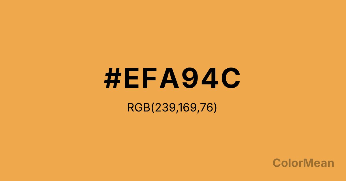 #EFA94C RGB value is (239, 169, 76). The hex color red value is 239, green is 169, and blue is 76. Its HSL format shows a hue of 34°, saturation of 84 percent, and lightness of 62 percent. The CMYK process values are 0 percent, 29 percent, 68 percent, 6 percent.