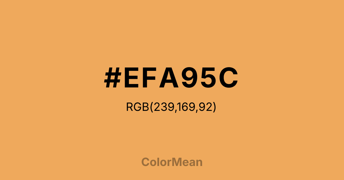 #EFA95C RGB value is (239, 169, 92). The hex color red value is 239, green is 169, and blue is 92. Its HSL format shows a hue of 31°, saturation of 82 percent, and lightness of 65 percent. The CMYK process values are 0 percent, 29 percent, 62 percent, 6 percent.