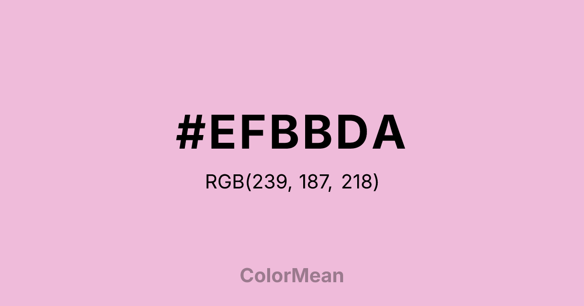 #EFBBDA RGB value is (239, 187, 218). The hex color red value is 239, green is 187, and blue is 218. Its HSL format shows a hue of 324°, saturation of 62 percent, and lightness of 84 percent. The CMYK process values are 0 percent, 22 percent, 9 percent, 6 percent.