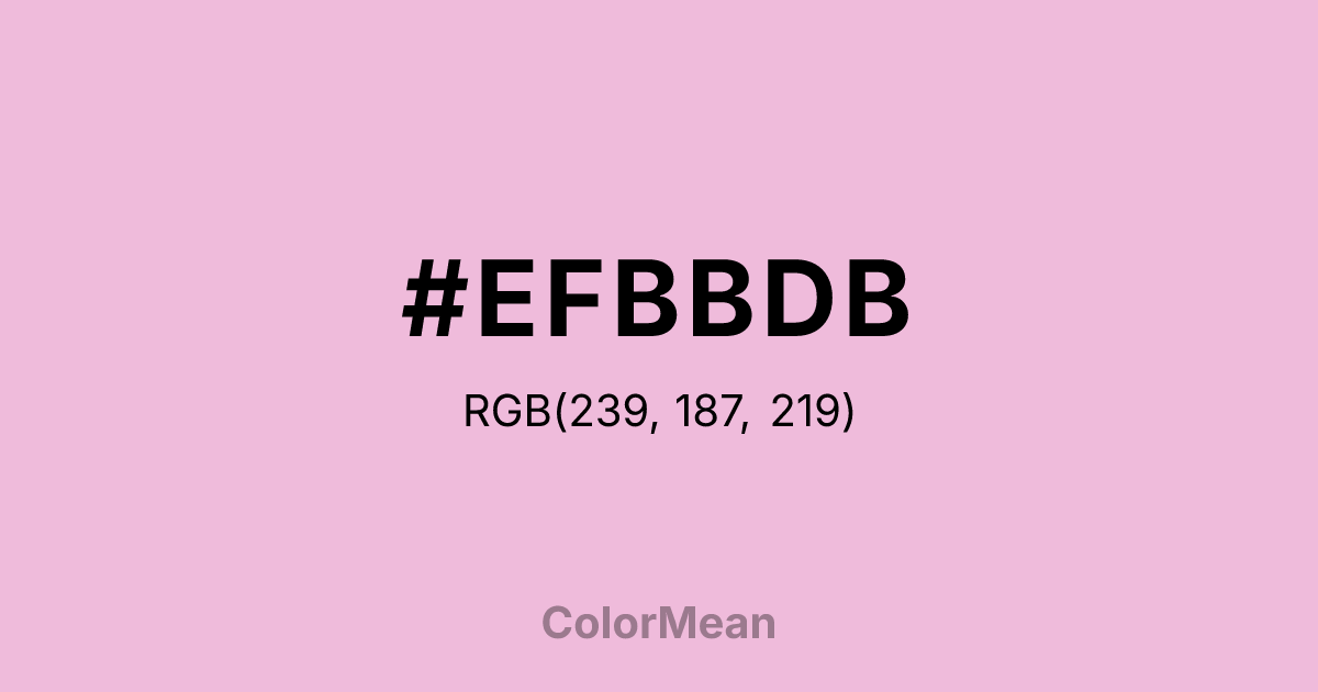 #EFBBDB RGB value is (239, 187, 219). The hex color red value is 239, green is 187, and blue is 219. Its HSL format shows a hue of 323°, saturation of 62 percent, and lightness of 84 percent. The CMYK process values are 0 percent, 22 percent, 8 percent, 6 percent.