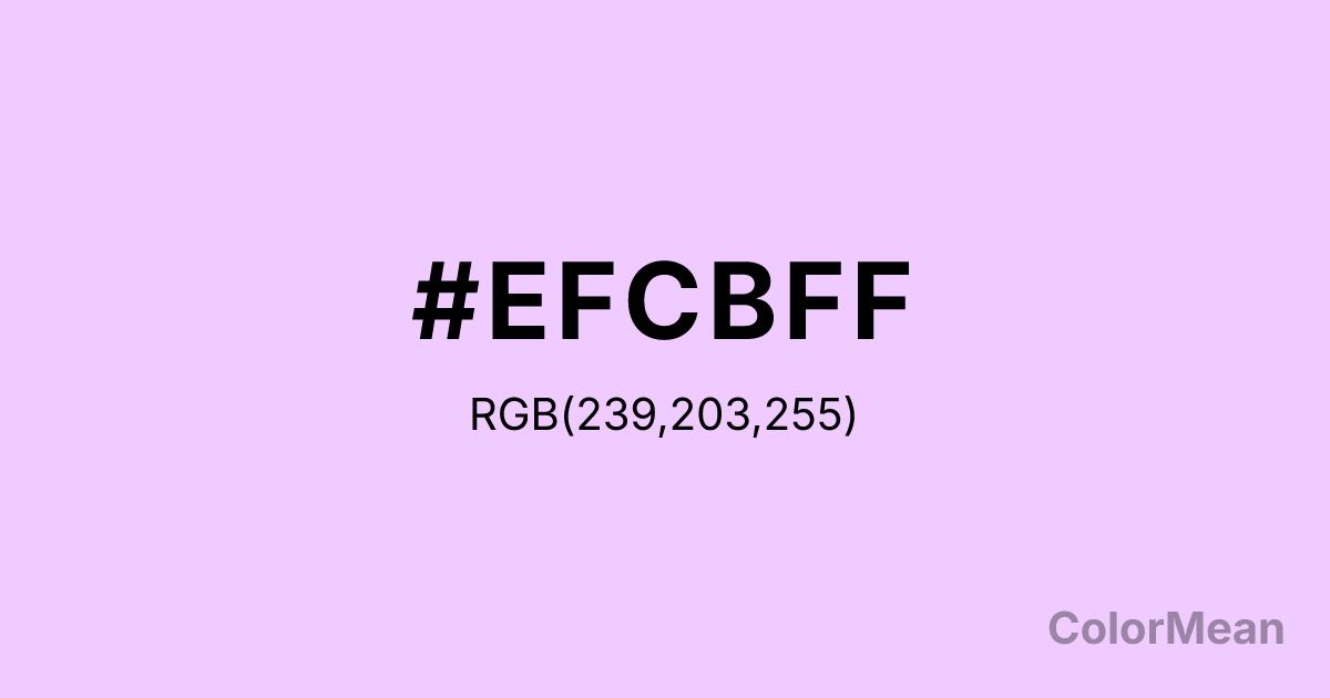 #EFCBFF RGB value is (239, 203, 255). The hex color red value is 239, green is 203, and blue is 255. Its HSL format shows a hue of 282°, saturation of 100 percent, and lightness of 90 percent. The CMYK process values are 6 percent, 20 percent, 0 percent, 0 percent.