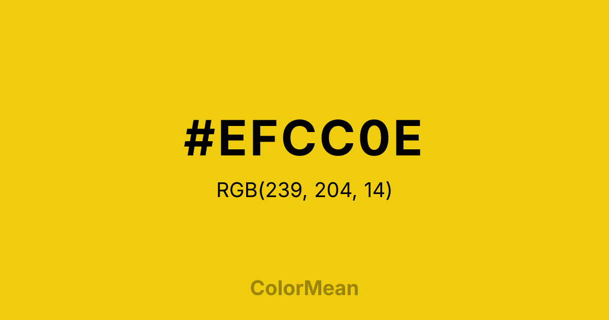 #EFCC0E RGB value is (239, 204, 14). The hex color red value is 239, green is 204, and blue is 14. Its HSL format shows a hue of 51°, saturation of 89 percent, and lightness of 50 percent. The CMYK process values are 0 percent, 15 percent, 94 percent, 6 percent.