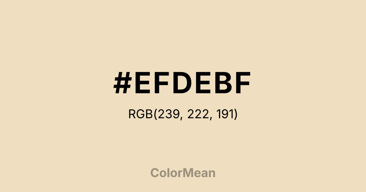 #EFDEBF RGB value is (239, 222, 191). The hex color red value is 239, green is 222, and blue is 191. Its HSL format shows a hue of 39°, saturation of 60 percent, and lightness of 84 percent. The CMYK process values are 0 percent, 7 percent, 20 percent, 6 percent.