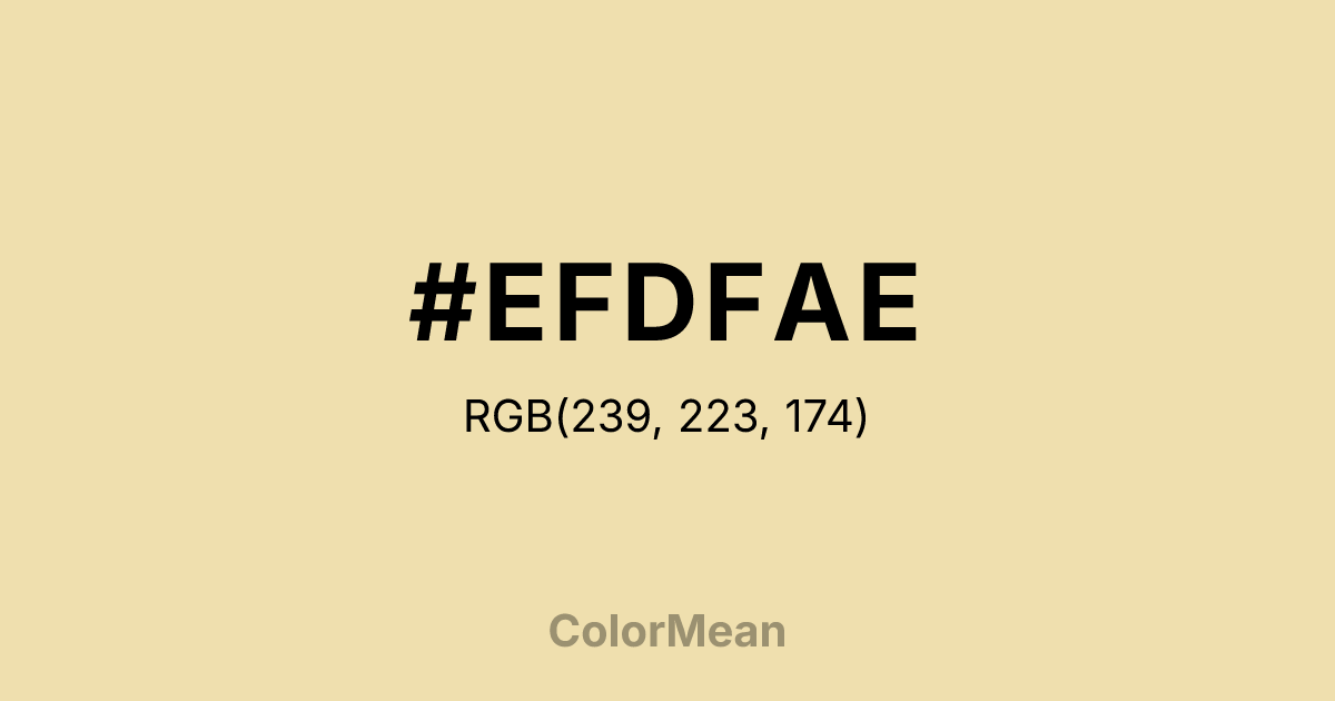 #EFDFAE RGB value is (239, 223, 174). The hex color red value is 239, green is 223, and blue is 174. Its HSL format shows a hue of 45°, saturation of 67 percent, and lightness of 81 percent. The CMYK process values are 0 percent, 7 percent, 27 percent, 6 percent.