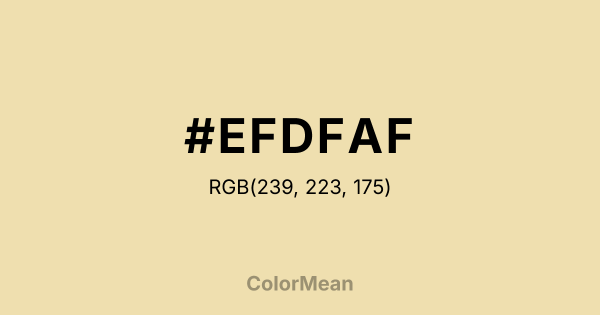 #EFDFAF RGB value is (239, 223, 175). The hex color red value is 239, green is 223, and blue is 175. Its HSL format shows a hue of 45°, saturation of 67 percent, and lightness of 81 percent. The CMYK process values are 0 percent, 7 percent, 27 percent, 6 percent.