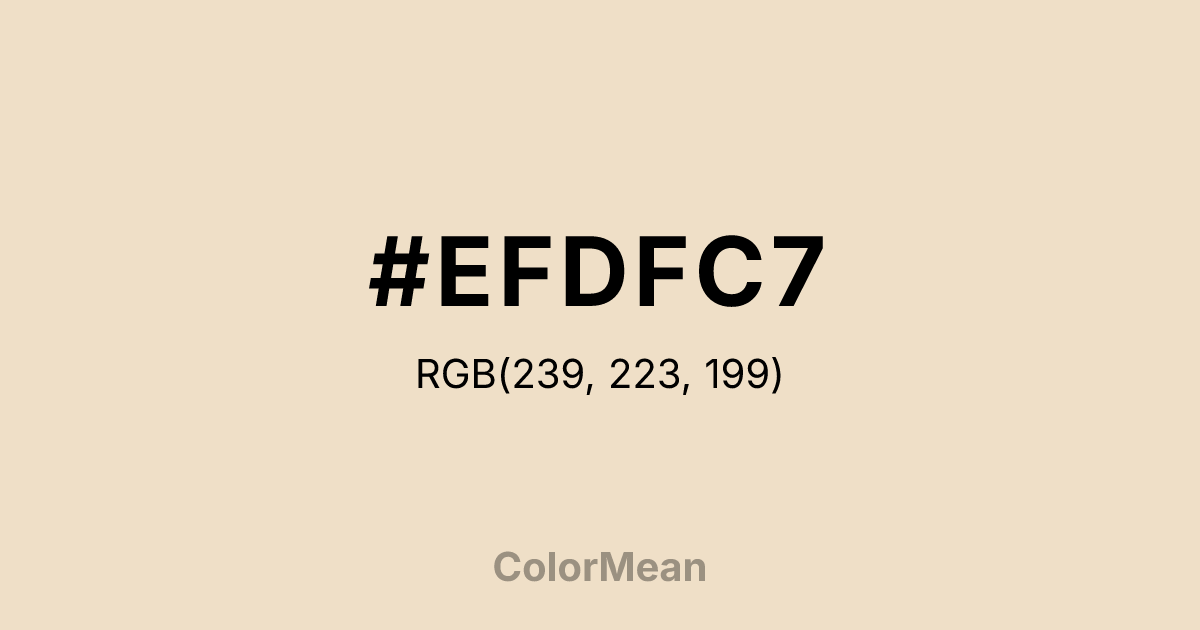 #EFDFC7 RGB value is (239, 223, 199). The hex color red value is 239, green is 223, and blue is 199. Its HSL format shows a hue of 36°, saturation of 56 percent, and lightness of 86 percent. The CMYK process values are 0 percent, 7 percent, 17 percent, 6 percent.