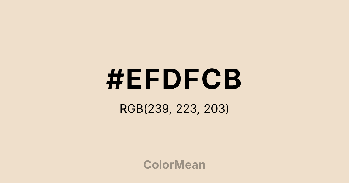 #EFDFCB RGB value is (239, 223, 203). The hex color red value is 239, green is 223, and blue is 203. Its HSL format shows a hue of 33°, saturation of 53 percent, and lightness of 87 percent. The CMYK process values are 0 percent, 7 percent, 15 percent, 6 percent.