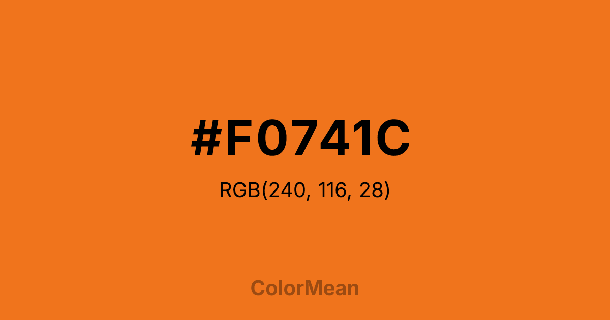#F0741C RGB value is (240, 116, 28). The hex color red value is 240, green is 116, and blue is 28. Its HSL format shows a hue of 25°, saturation of 88 percent, and lightness of 53 percent. The CMYK process values are 0 percent, 52 percent, 88 percent, 6 percent.