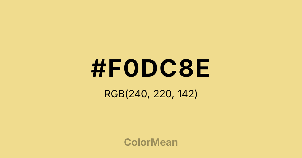 #F0DC8E RGB value is (240, 220, 142). The hex color red value is 240, green is 220, and blue is 142. Its HSL format shows a hue of 48°, saturation of 77 percent, and lightness of 75 percent. The CMYK process values are 0 percent, 8 percent, 41 percent, 6 percent.