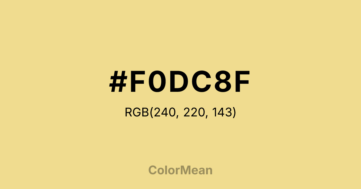 #F0DC8F RGB value is (240, 220, 143). The hex color red value is 240, green is 220, and blue is 143. Its HSL format shows a hue of 48°, saturation of 76 percent, and lightness of 75 percent. The CMYK process values are 0 percent, 8 percent, 40 percent, 6 percent.