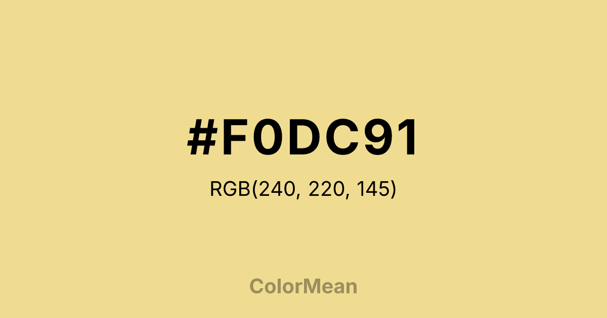 #F0DC91 RGB value is (240, 220, 145). The hex color red value is 240, green is 220, and blue is 145. Its HSL format shows a hue of 47°, saturation of 76 percent, and lightness of 75 percent. The CMYK process values are 0 percent, 8 percent, 40 percent, 6 percent.