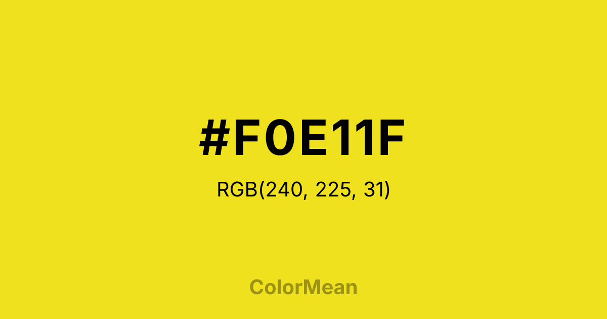 #F0E11F RGB value is (240, 225, 31). The hex color red value is 240, green is 225, and blue is 31. Its HSL format shows a hue of 56°, saturation of 87 percent, and lightness of 53 percent. The CMYK process values are 0 percent, 6 percent, 87 percent, 6 percent.