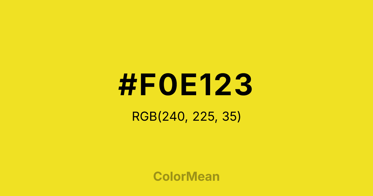 #F0E123 RGB value is (240, 225, 35). The hex color red value is 240, green is 225, and blue is 35. Its HSL format shows a hue of 56°, saturation of 87 percent, and lightness of 54 percent. The CMYK process values are 0 percent, 6 percent, 85 percent, 6 percent.