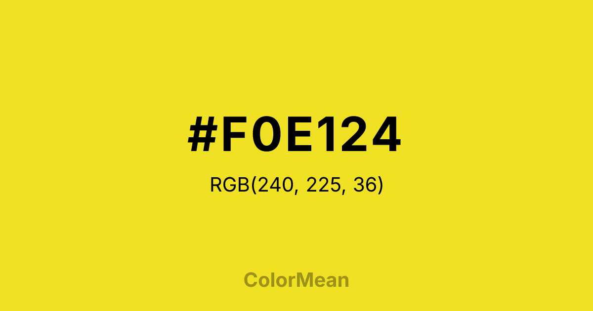 #F0E124 RGB value is (240, 225, 36). The hex color red value is 240, green is 225, and blue is 36. Its HSL format shows a hue of 56°, saturation of 87 percent, and lightness of 54 percent. The CMYK process values are 0 percent, 6 percent, 85 percent, 6 percent.