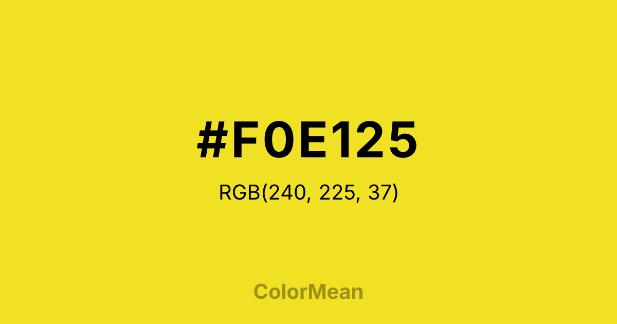 #F0E125 RGB value is (240, 225, 37). The hex color red value is 240, green is 225, and blue is 37. Its HSL format shows a hue of 56°, saturation of 87 percent, and lightness of 54 percent. The CMYK process values are 0 percent, 6 percent, 85 percent, 6 percent.
