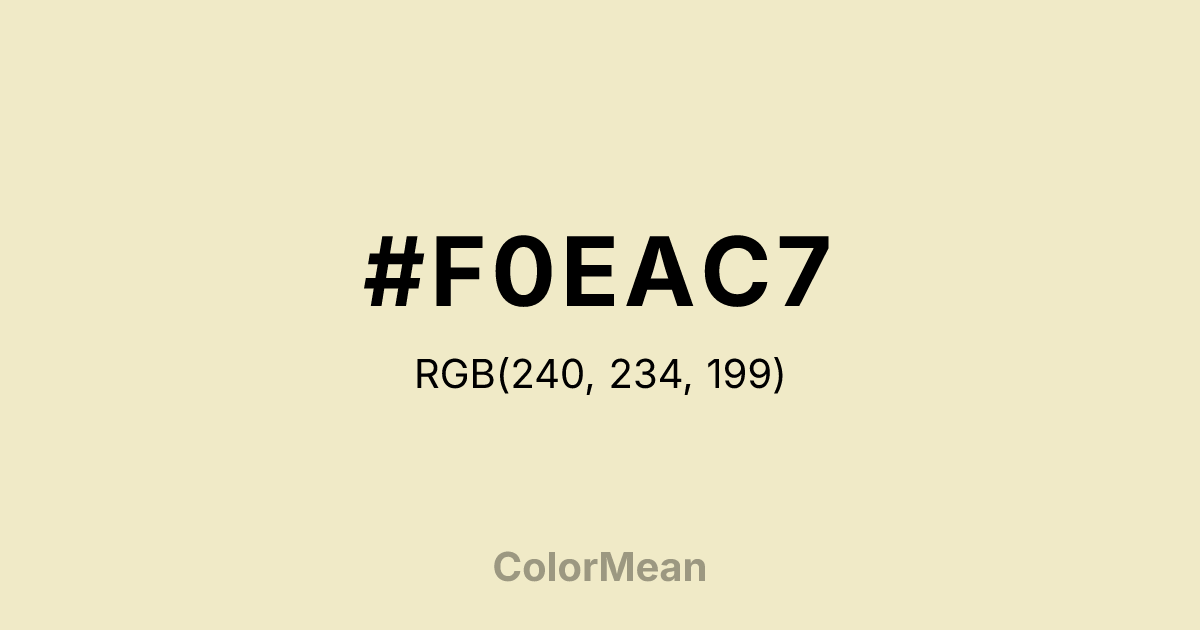 #F0EAC7 RGB value is (240, 234, 199). The hex color red value is 240, green is 234, and blue is 199. Its HSL format shows a hue of 51°, saturation of 58 percent, and lightness of 86 percent. The CMYK process values are 0 percent, 3 percent, 17 percent, 6 percent.