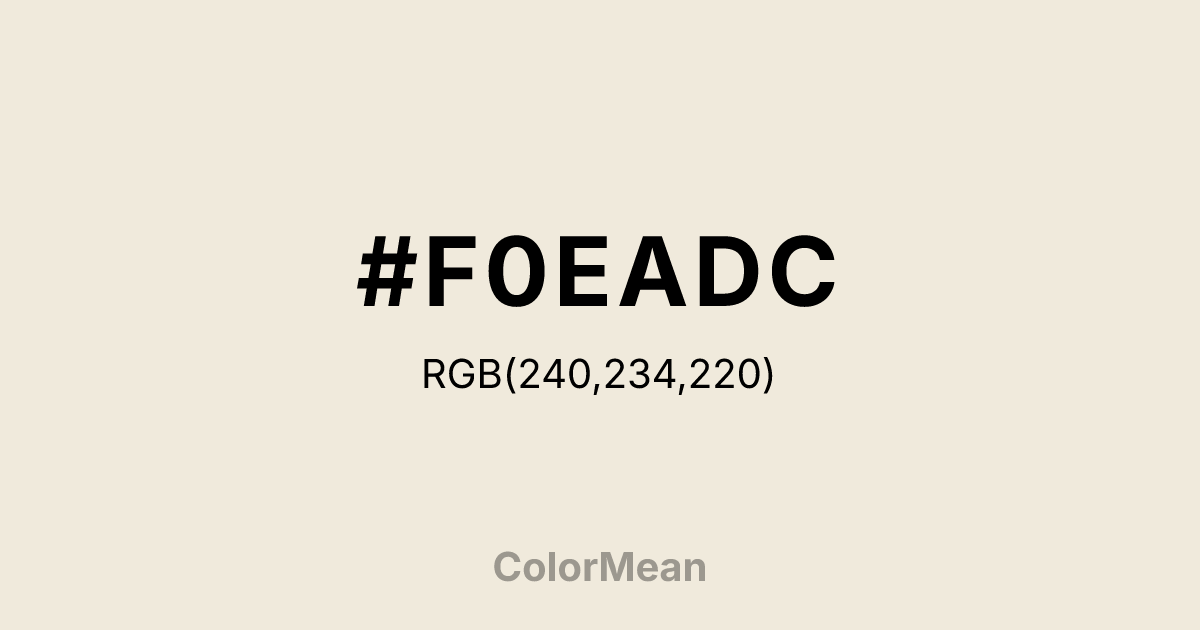 #F0EADC RGB value is (240, 234, 220). The hex color red value is 240, green is 234, and blue is 220. Its HSL format shows a hue of 42°, saturation of 40 percent, and lightness of 90 percent. The CMYK process values are 0 percent, 3 percent, 8 percent, 6 percent.