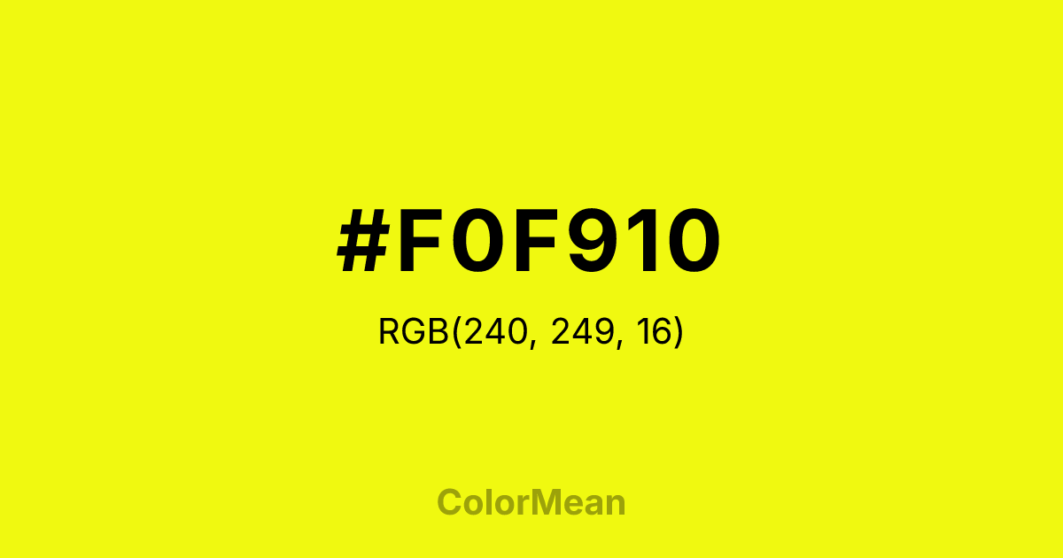 #F0F910 RGB value is (240, 249, 16). The hex color red value is 240, green is 249, and blue is 16. Its HSL format shows a hue of 62°, saturation of 95 percent, and lightness of 52 percent. The CMYK process values are 4 percent, 0 percent, 94 percent, 2 percent.