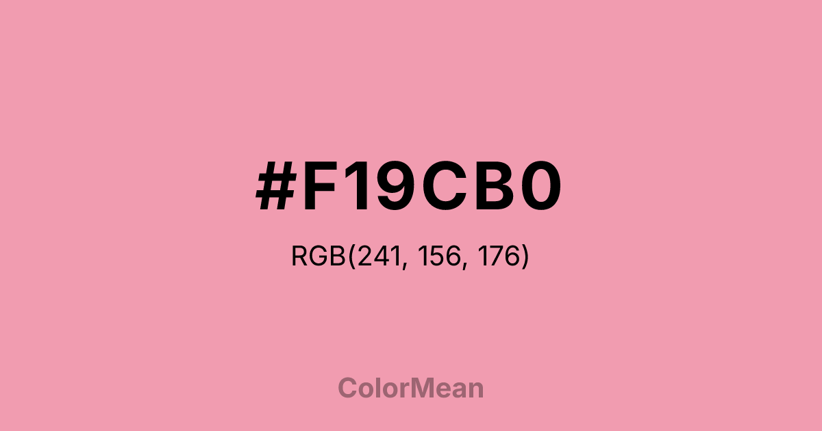 #F19CB0 RGB value is (241, 156, 176). The hex color red value is 241, green is 156, and blue is 176. Its HSL format shows a hue of 346°, saturation of 75 percent, and lightness of 78 percent. The CMYK process values are 0 percent, 35 percent, 27 percent, 5 percent.