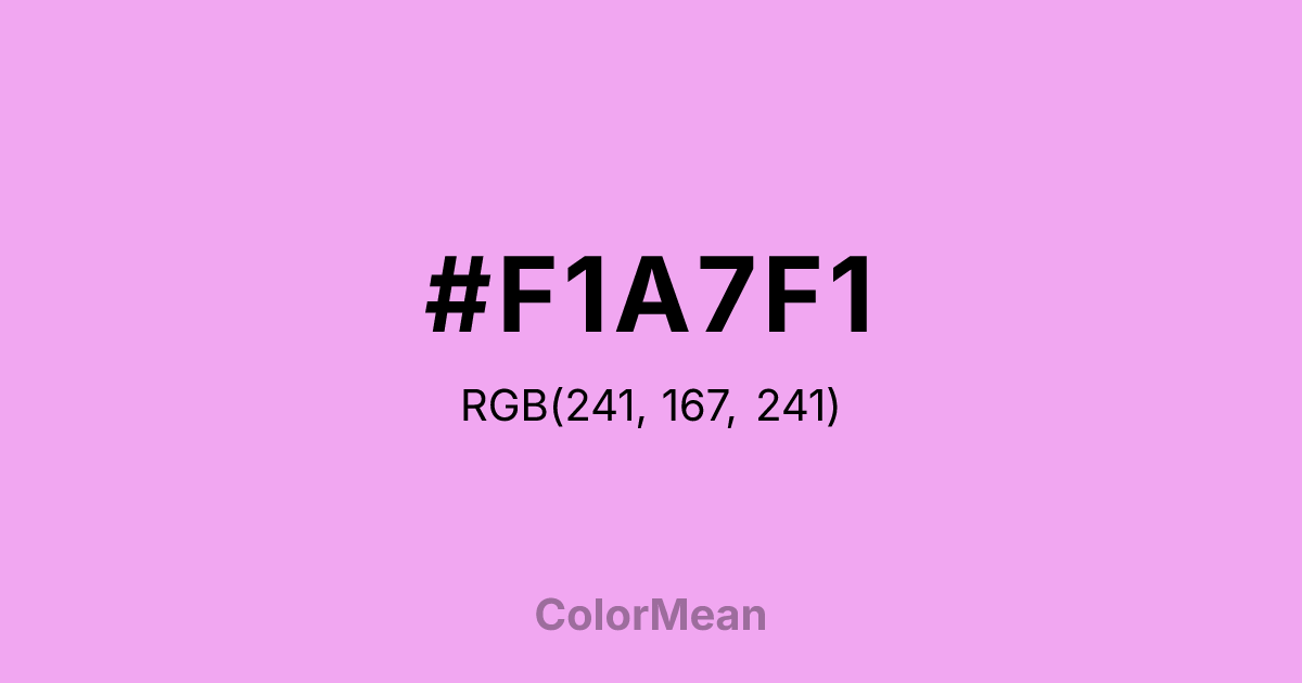 #F1A7F1 RGB value is (241, 167, 241). The hex color red value is 241, green is 167, and blue is 241. Its HSL format shows a hue of 300°, saturation of 73 percent, and lightness of 80 percent. The CMYK process values are 0 percent, 31 percent, 0 percent, 5 percent.