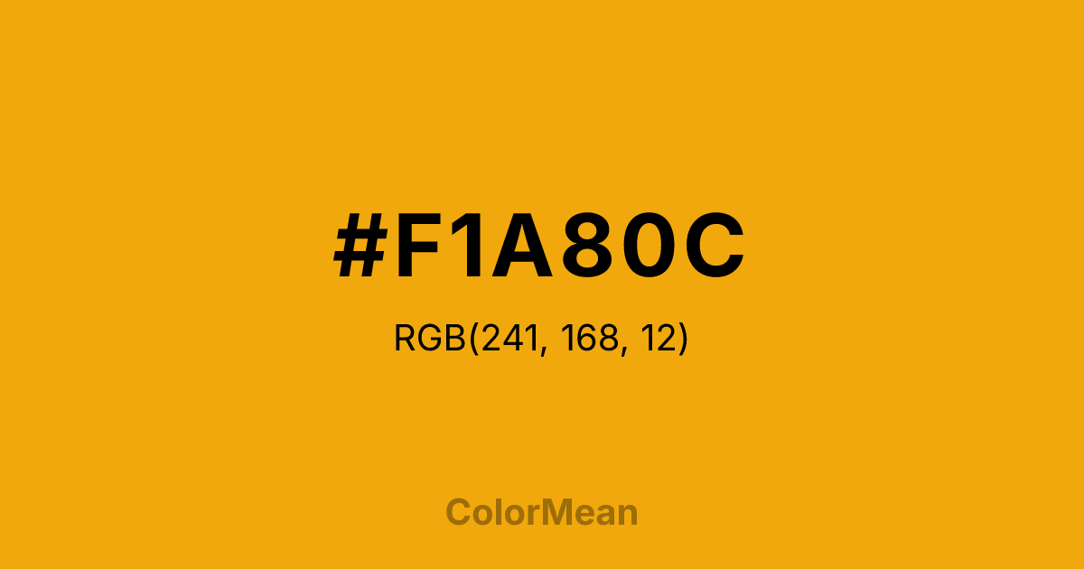 #F1A80C RGB value is (241, 168, 12). The hex color red value is 241, green is 168, and blue is 12. Its HSL format shows a hue of 41°, saturation of 91 percent, and lightness of 50 percent. The CMYK process values are 0 percent, 30 percent, 95 percent, 5 percent.