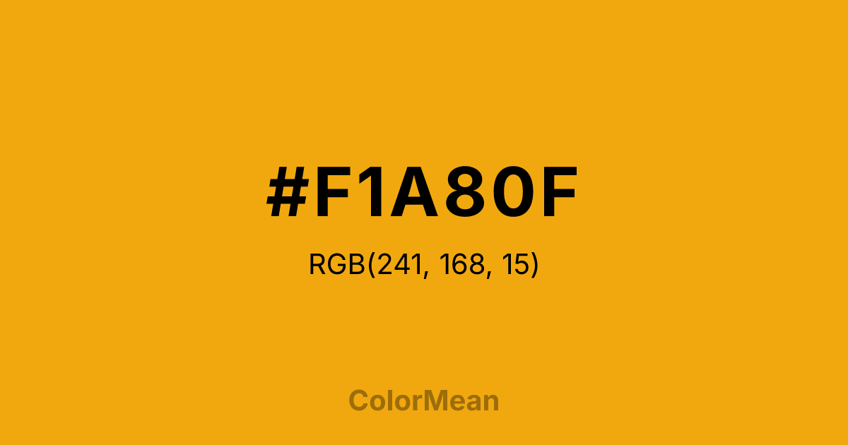 #F1A80F RGB value is (241, 168, 15). The hex color red value is 241, green is 168, and blue is 15. Its HSL format shows a hue of 41°, saturation of 89 percent, and lightness of 50 percent. The CMYK process values are 0 percent, 30 percent, 94 percent, 5 percent.