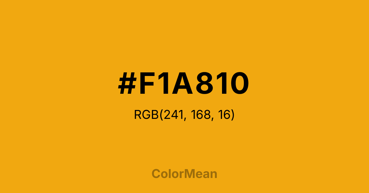 #F1A810 RGB value is (241, 168, 16). The hex color red value is 241, green is 168, and blue is 16. Its HSL format shows a hue of 41°, saturation of 89 percent, and lightness of 50 percent. The CMYK process values are 0 percent, 30 percent, 93 percent, 5 percent.