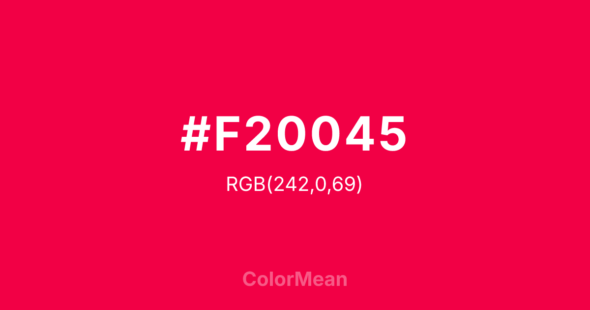 #F20045 RGB value is (242, 0, 69). The hex color red value is 242, green is 0, and blue is 69. Its HSL format shows a hue of 343°, saturation of 100 percent, and lightness of 47 percent. The CMYK process values are 0 percent, 100 percent, 71 percent, 5 percent.