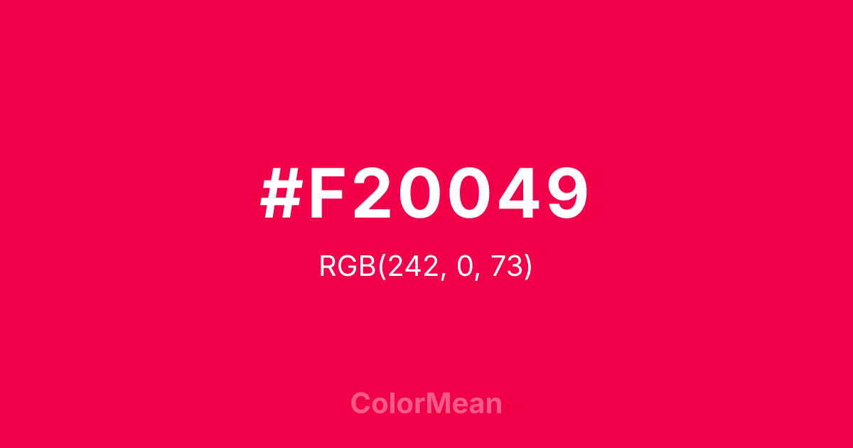#F20049 RGB value is (242, 0, 73). The hex color red value is 242, green is 0, and blue is 73. Its HSL format shows a hue of 342°, saturation of 100 percent, and lightness of 47 percent. The CMYK process values are 0 percent, 100 percent, 70 percent, 5 percent.