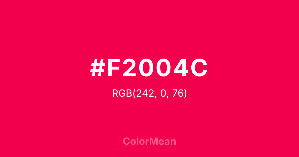 #F2004C RGB value is (242, 0, 76). The hex color red value is 242, green is 0, and blue is 76. Its HSL format shows a hue of 341°, saturation of 100 percent, and lightness of 47 percent. The CMYK process values are 0 percent, 100 percent, 69 percent, 5 percent.