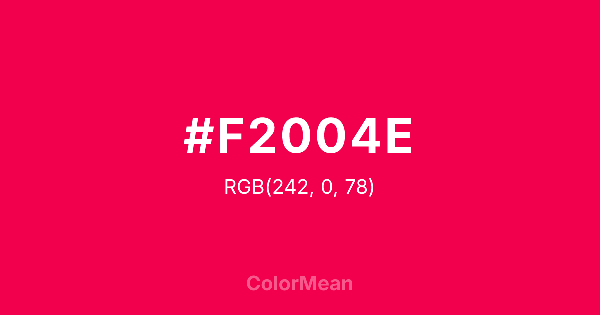 #F2004E RGB value is (242, 0, 78). The hex color red value is 242, green is 0, and blue is 78. Its HSL format shows a hue of 341°, saturation of 100 percent, and lightness of 47 percent. The CMYK process values are 0 percent, 100 percent, 68 percent, 5 percent.