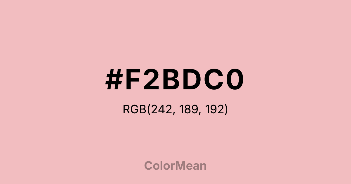 #F2BDC0 RGB value is (242, 189, 192). The hex color red value is 242, green is 189, and blue is 192. Its HSL format shows a hue of 357°, saturation of 67 percent, and lightness of 85 percent. The CMYK process values are 0 percent, 22 percent, 21 percent, 5 percent.