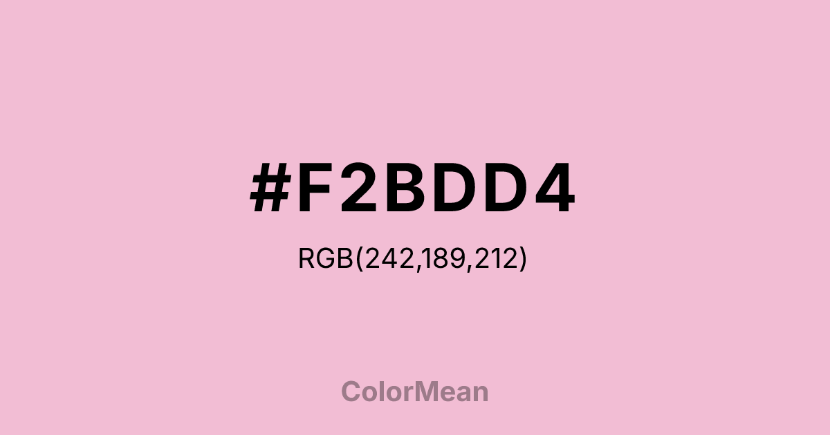 #F2BDD4 RGB value is (242, 189, 212). The hex color red value is 242, green is 189, and blue is 212. Its HSL format shows a hue of 334°, saturation of 67 percent, and lightness of 85 percent. The CMYK process values are 0 percent, 22 percent, 12 percent, 5 percent.