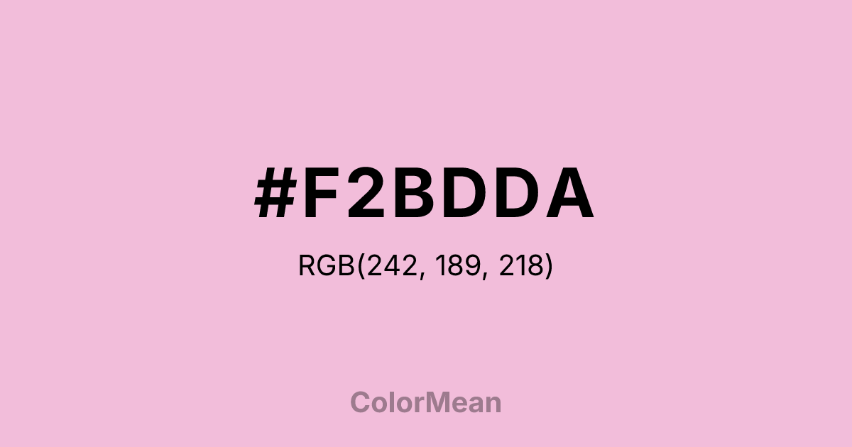 #F2BDDA RGB value is (242, 189, 218). The hex color red value is 242, green is 189, and blue is 218. Its HSL format shows a hue of 327°, saturation of 67 percent, and lightness of 85 percent. The CMYK process values are 0 percent, 22 percent, 10 percent, 5 percent.