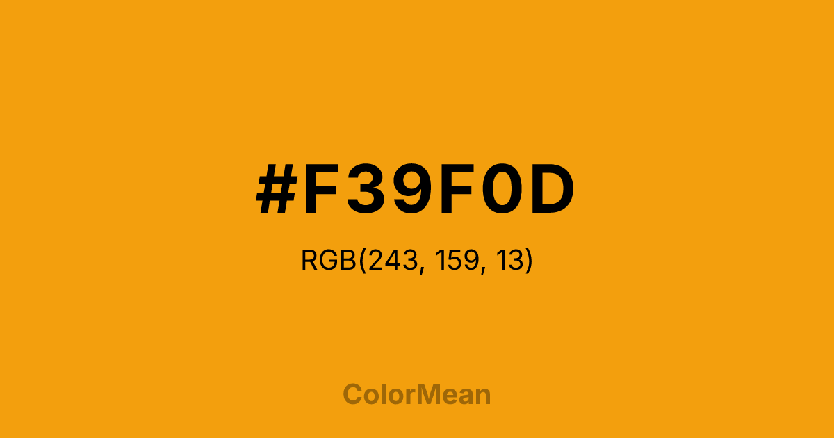 #F39F0D RGB value is (243, 159, 13). The hex color red value is 243, green is 159, and blue is 13. Its HSL format shows a hue of 38°, saturation of 91 percent, and lightness of 50 percent. The CMYK process values are 0 percent, 35 percent, 95 percent, 5 percent.