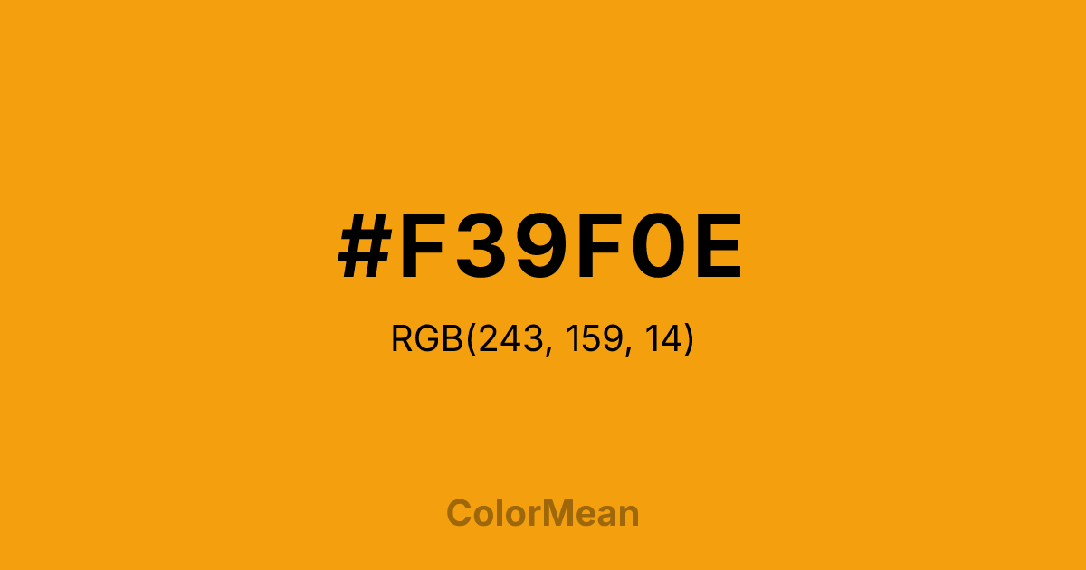 #F39F0E RGB value is (243, 159, 14). The hex color red value is 243, green is 159, and blue is 14. Its HSL format shows a hue of 38°, saturation of 91 percent, and lightness of 50 percent. The CMYK process values are 0 percent, 35 percent, 94 percent, 5 percent.