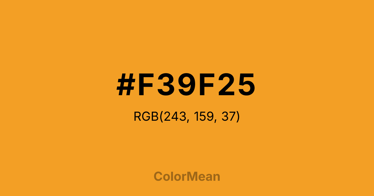 #F39F25 RGB value is (243, 159, 37). The hex color red value is 243, green is 159, and blue is 37. Its HSL format shows a hue of 36°, saturation of 90 percent, and lightness of 55 percent. The CMYK process values are 0 percent, 35 percent, 85 percent, 5 percent.